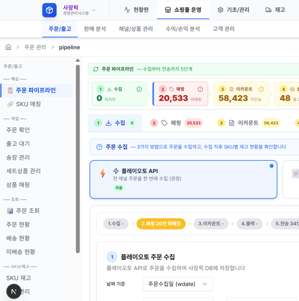 - 20년 경력의 ERP 시스템 한계 극복 이야기 – AI 맞춤형 개발작성자: sajangpick왜 시작했는가? 20년의 경험을 통해 느낀 ERP 시스템의 한계와 이를 극복하기 위한 나의 결심에 대한 이야기입니다. 이카운트의 한계와 자체 시스템 개발 결정 온라인 쇼핑몰을 운영하며 이카운트 ERP를 도입했지만, 제게는 큰 한계가 있었습니다. 채널별 마진율을 정확히 계산하지 못하고, 재고 부족을 예측하는 데에도 실패했습니다. 20년의 경력 속에서 저는 이러한 문제를 해결하기 위해 AI를 활용한 맞춤형 경영관리 시스템을… 자세히 보기: 20년 경력의 ERP 시스템 한계 극복 이야기 – AI 맞춤형 개발